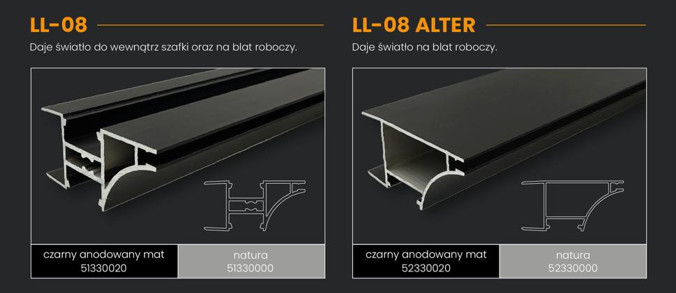 Profile LL-08 i LL-08 ALTER są teraz dostępne w kolorze anodowany czarny mat. To wykończenie wprowadza nowy wymiar estetyki do zabudowy meblowej, łącząc precyzję wykonania z modną, matową czernią. Subtelne, a jednocześnie wyraziste – idealne do nowoczesnych projektów.